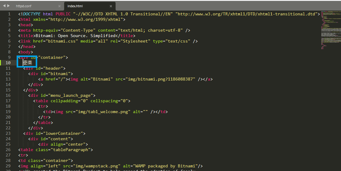 C:\Bitnami\wampstack-8.1.8-0 나의 경우 해당 경로로 폴더가 열리는데 해당 경로에서 C:\Bitnami\wampstack-8.1.8-0\apache2\conf apache 설정 경로로 이동하면 해당 경로 내에 httpd.conf 파일이 있다. 해당 파일을 메모장으로 열면 apache 설정 내용들이 정의되어 있는데
