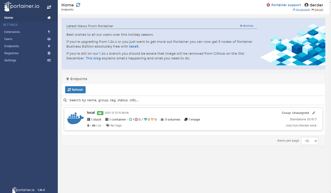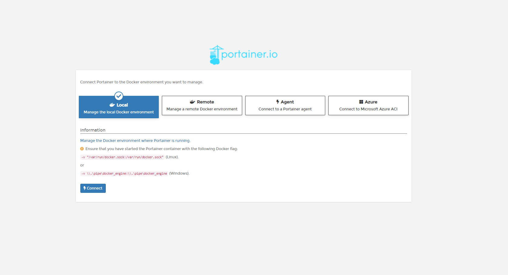 외부 컨테이너를 관리할 수도 있지만 내 프로젝트만 관리할 것이기 때문에 local로 설정하여 portainer를 실행시킨다.