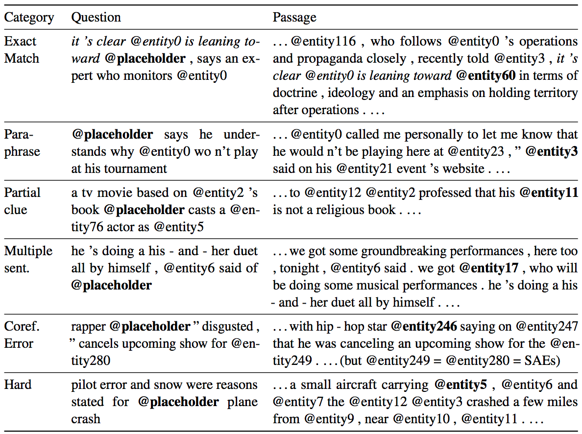 Human generated abstractive summary bullets were generated from news stories in CNN and Daily Mail websites as questions (with one of the entities hidden), and stories as the corresponding passages from which the system is expected to answer the fill-in the-blank question. The authors released the scripts that crawl, extract and generate pairs of passages and questions from these websites.