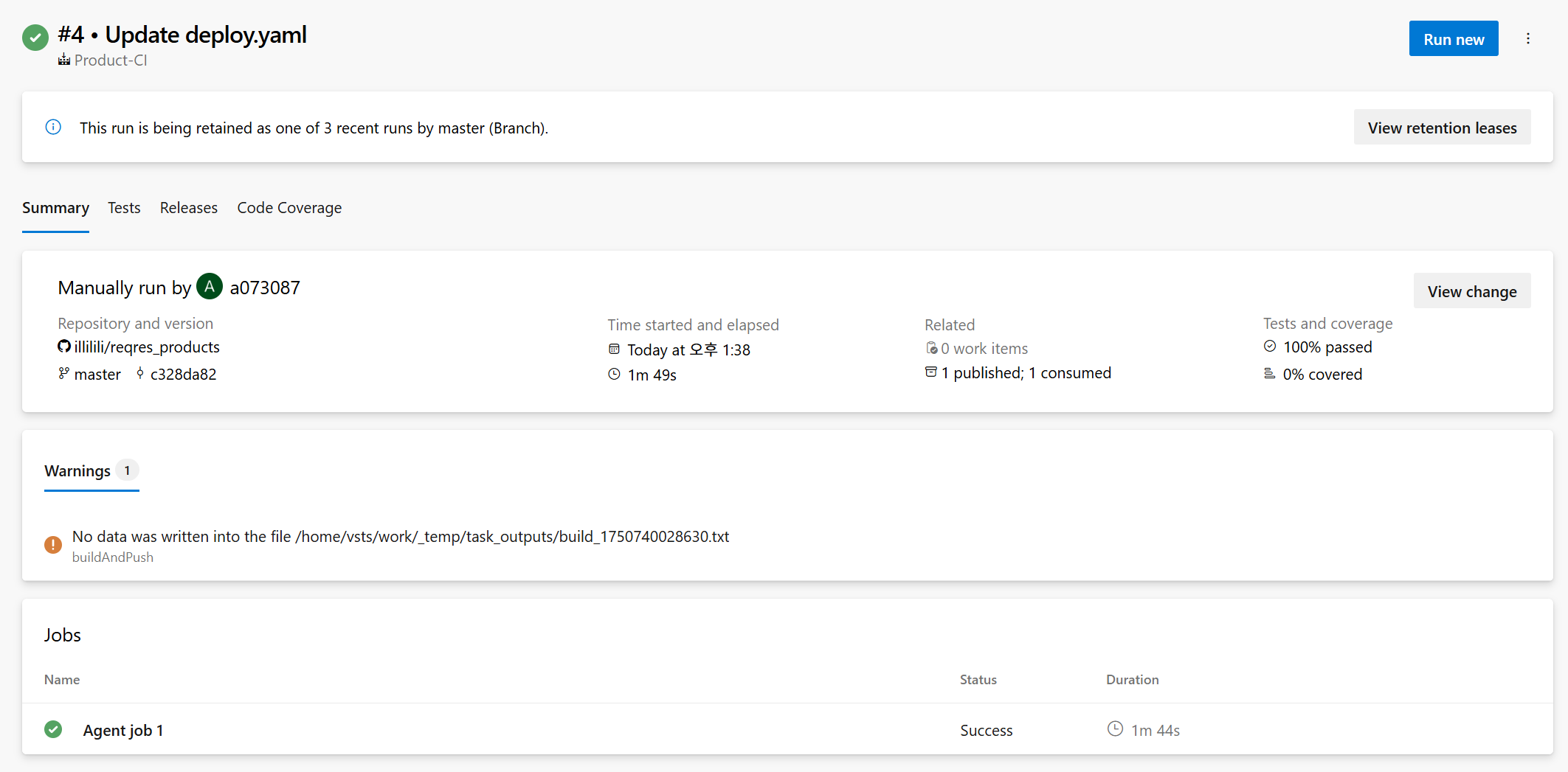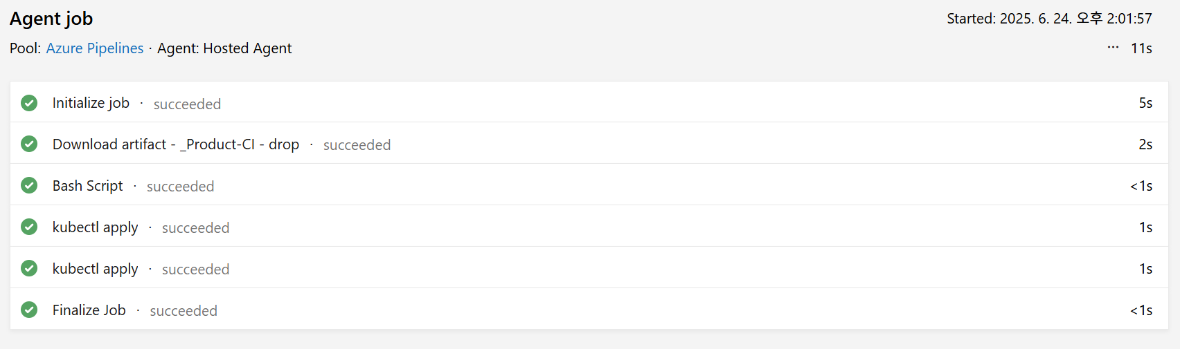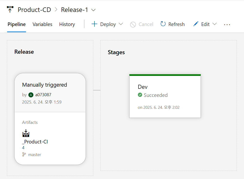 kubectl apply -f $(System.DefaultWorkingDirectory)/_Product-CI/drop/azure/deploy.yaml-n <namespace>Release-1 생성됨Dev Stages에서 Succeeded