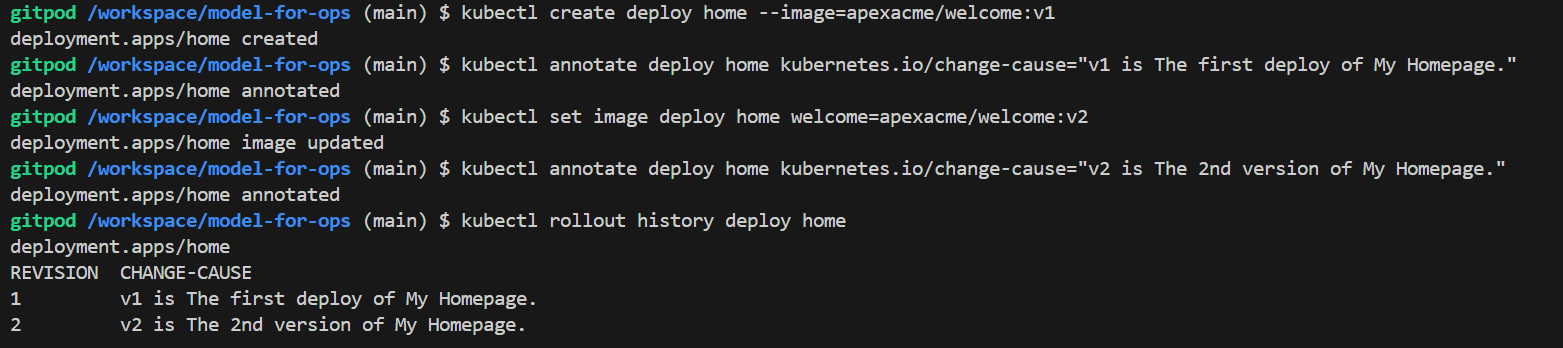 kubectl annotate deploy home kubernetes.io/change-cause="v1 is The first deploy of My Homepage."