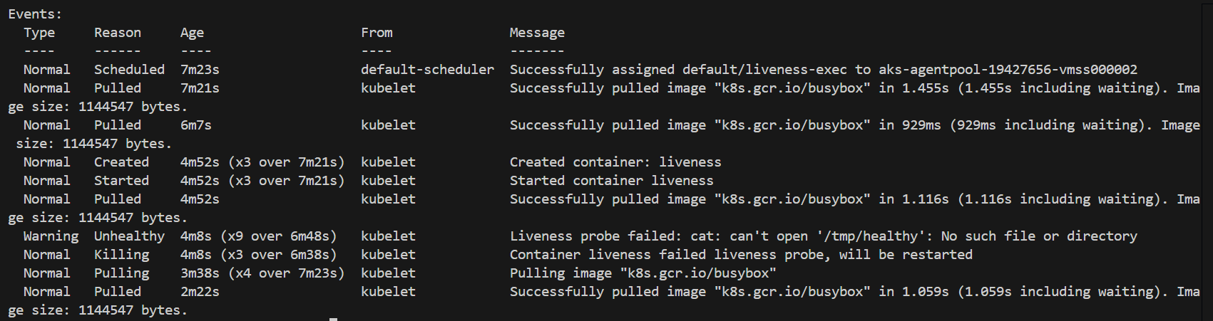 30초 후 /tmp/healthy 삭제 → probe 실패 → 컨테이너 재시작kubectl describe pod liveness-exec