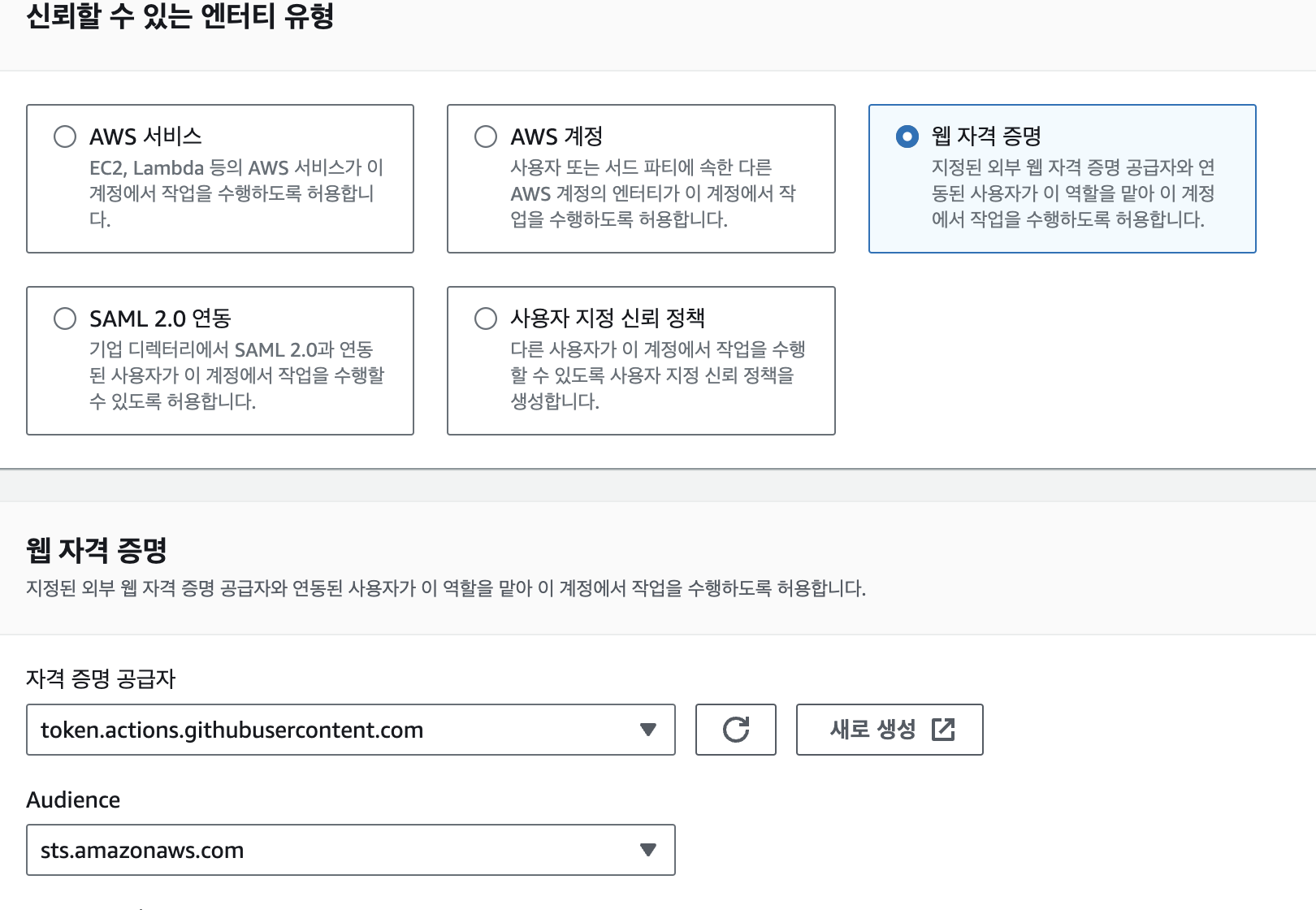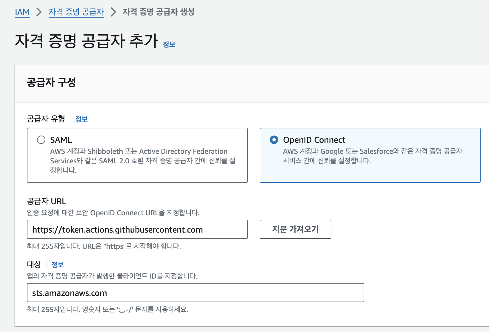 자격 증명 공급자에 https://token.actions.githubusercontent.com가 없는 경우 새로 생성 버튼을 눌러 하단과 같이 자격 증명 공급자를 추가해준다.