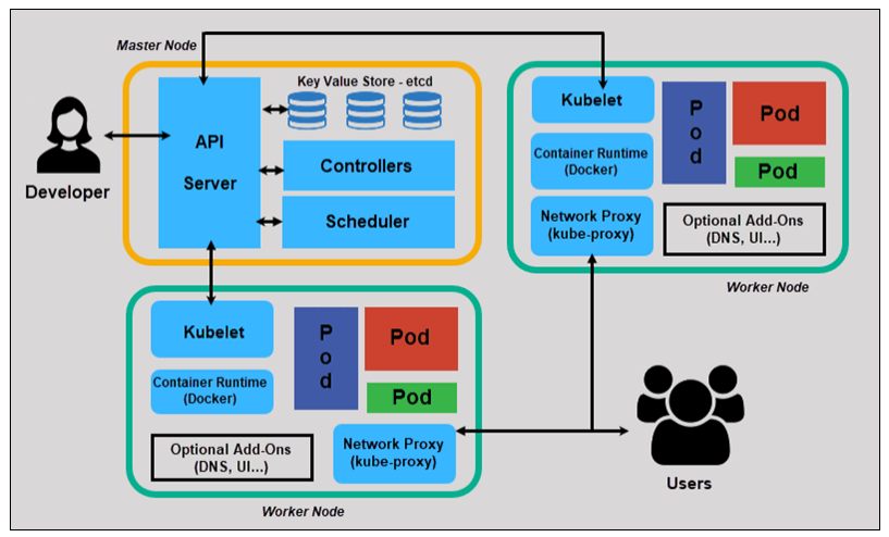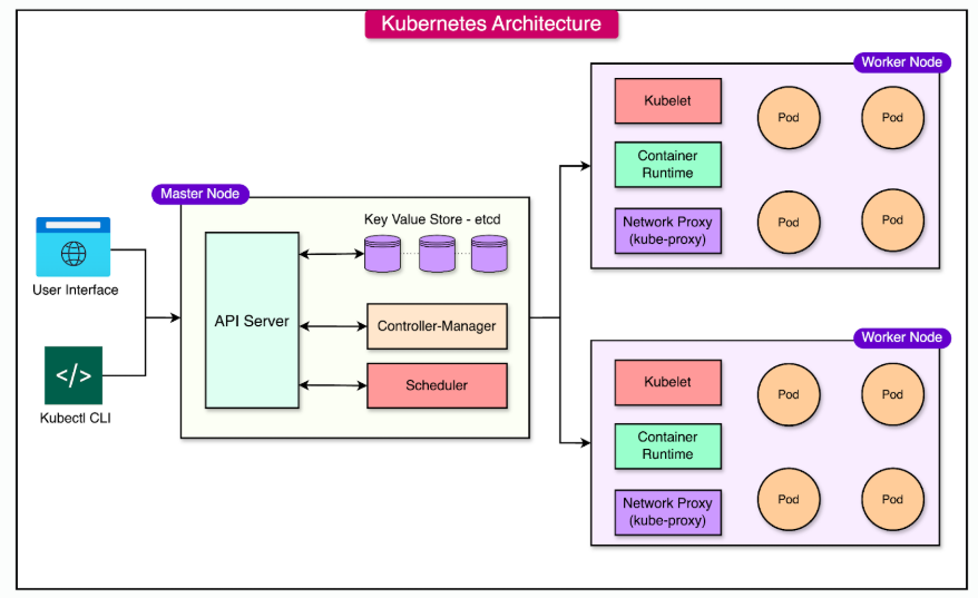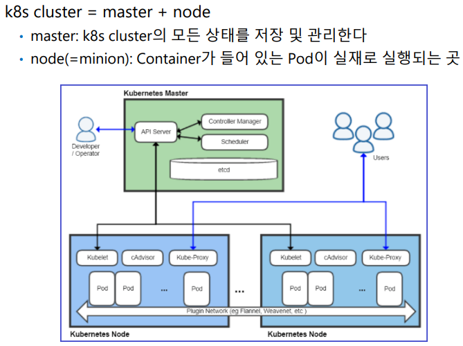 - Cluster : 가장 기본적인 단위, 여러 개의 node로 구성되며 마스터 노드(Control Plane)와 워커 노드(Worker Node)로 나뉨