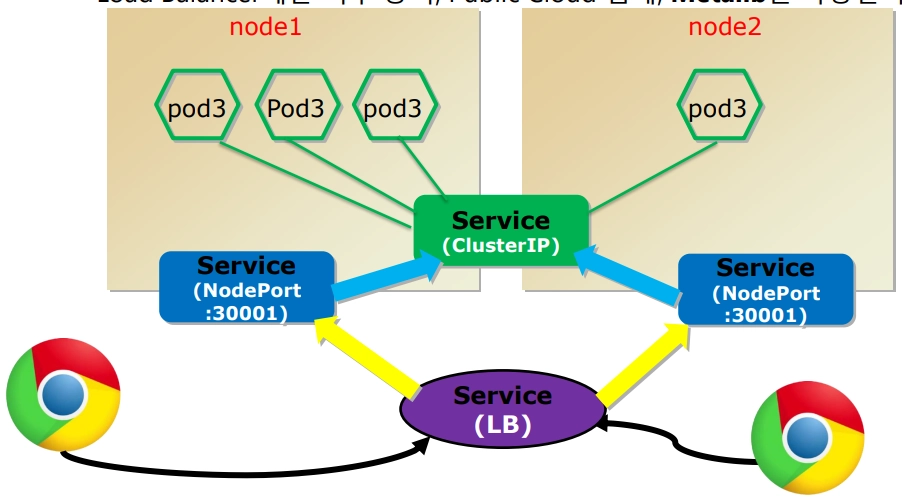 - 클러스터 밖에서 Pod 접속 → Load Balancer