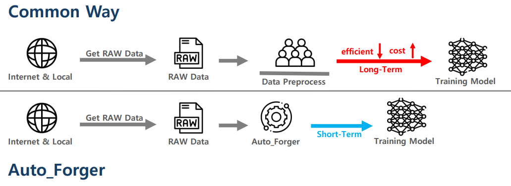 Auto_Forger를 통해, Data Pipleline을 개선하여, AI를 이용한 융합 서비스들의 개발 속도를 개선하며, 데이터를 가공하고 전처리하는 과정에서 드는 불필요한 인력과 비용을 최소화하여 기업과 단체의 금전적 손실을 최소화 하는 것. 그리고, 데이터에 아직 익숙하지 않은 초보자들과 입문자들의 흥미를 유발하여 Data Handling Skill에 대해서 한 걸음 더 나아갈 수 있게 모두를 잇는 것이 본 프로젝트의 목적이자, 앞으로의 비전이라고 할 수 있다.