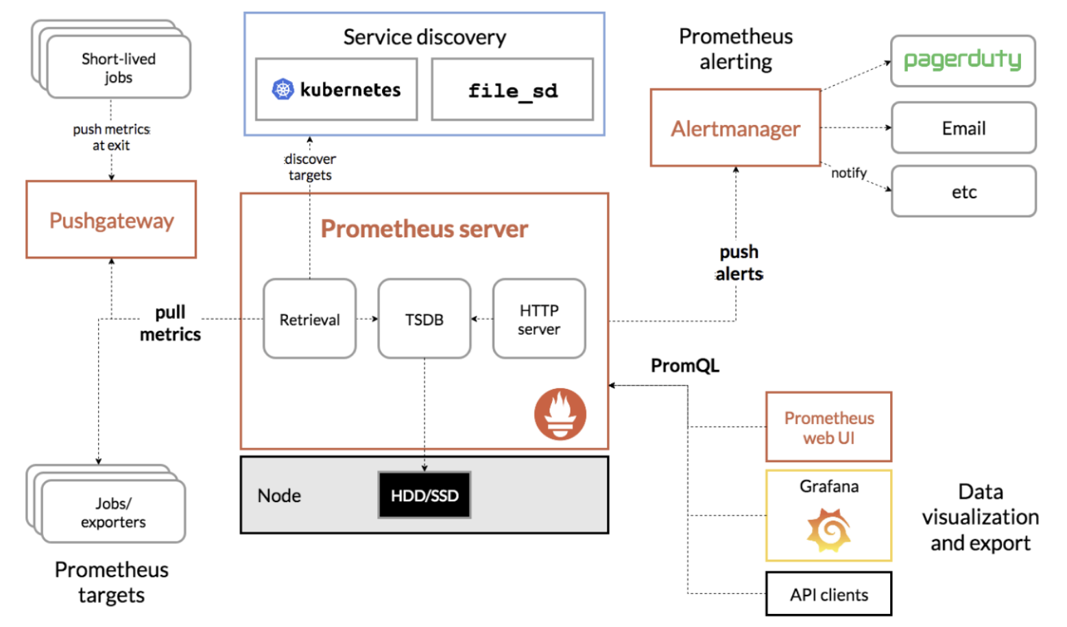 Prometheus는 오픈 소스 시스템 모니터링 및 경고 도구로, 클라우드 및 온프레미스 환경에서 시스템 및 서비스의 성능 및 가용성을 모니터링하는 데 사용된다. Metric 수집, 시각화, 알림 디스커버리 기능 등을 제공한다.