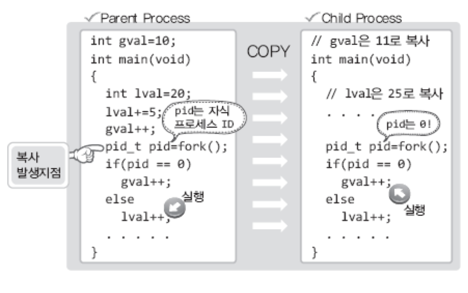 자식 프로세스는 fork 함수 호출을 통해서 복사된 프로세스이다.