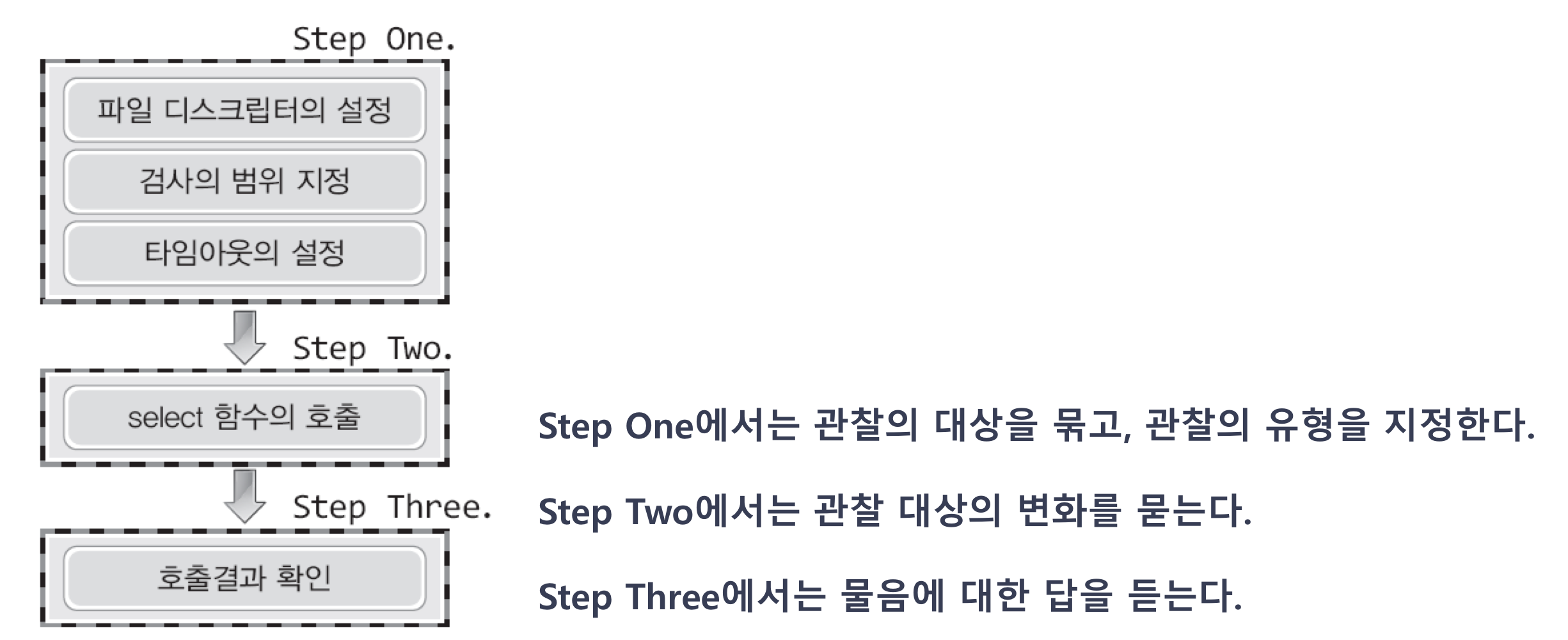 그림에서는 select 함수의 호출에 앞서 뭔가 준비가 필요하고, 또 호출 이후에도 결과의 확인을 위한 별도의 과정이 존재함을 보이고 있다.