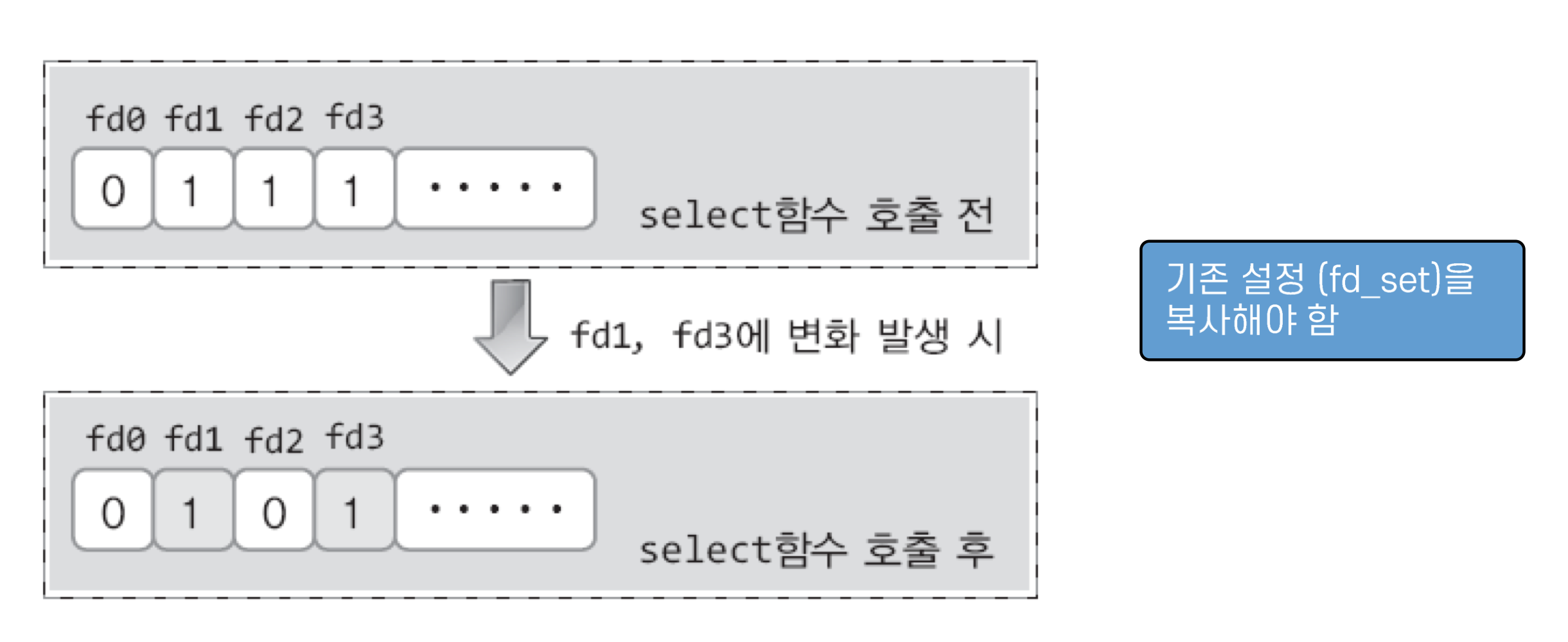 select 함수의 두 번째, 세 번째 그리고 네 번째 인자로 전달된 fd_set형 변수에 다음 그림에서 보이는 변화가 발생하기 때문에 어렵지 않게 알아낼 수 있다.