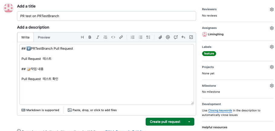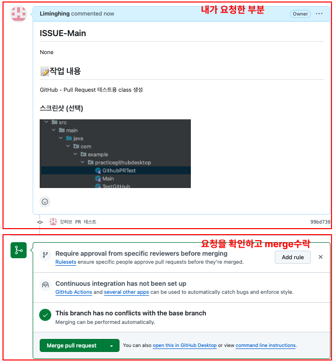 Pull Request(PR)는 본인의 작업(branch)을 메인 브랜치(main) 또는 다른 브랜치에 병합하기 전에 코드 리뷰를 요청