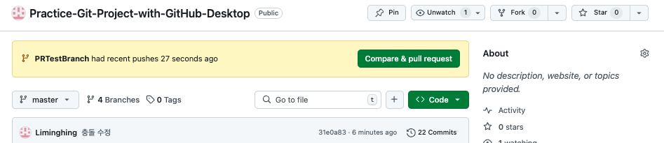 브랜치를 푸시하면 Compare & pull request 버튼이 나타납니다