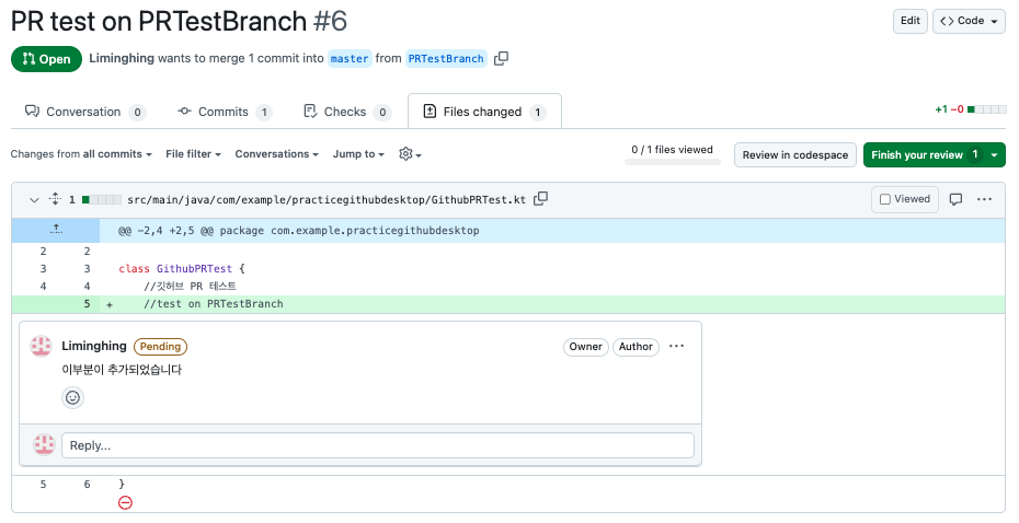리뷰는 상단에 있는 Files changed 를 통해 작성
