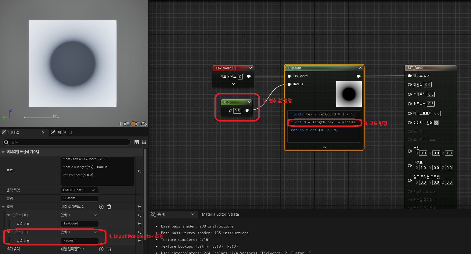 이제 여기에 Input Parameter로 Radius를 추가하고 값을 0.5로 설정하고 노드에 연결한 뒤, 코드를 다음과 같이 변경하자.