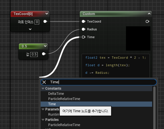 노드에 Time이라는 Input Parameter를 추가하고 Time 노드를 추가하자.
