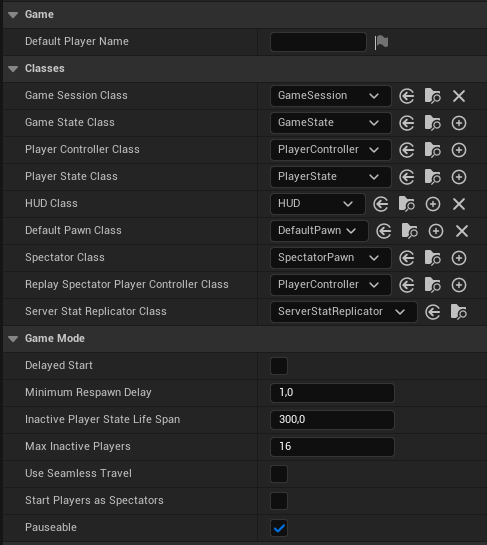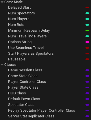 다음은 이미 상속된 변수들의 목록입니다. 일부는 GameMode 블루프린트의 ClassDefaults에서 설정할 수 있습니다.