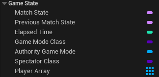 기본 AGameState 클래스에서 몇 가지 변수를 사용할 수 있습니다. PlayerArray, MatchState, ElapsedTime은 모두 복제(Replicated)되어 클라이언트에서도 접근할 수 있습니다.