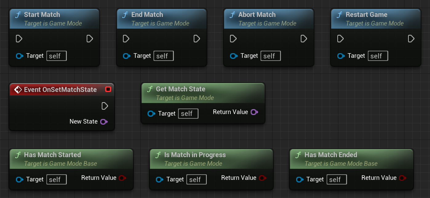 이 함수들과 이벤트들은 현재 MatchState를 제어하는 데 사용할 수 있습니다. 대부분은 'Ready To Start Match' 함수가 TRUE를 반환할 때 자동으로 호출되지만, 직접 수동으로 사용할 수도 있습니다.