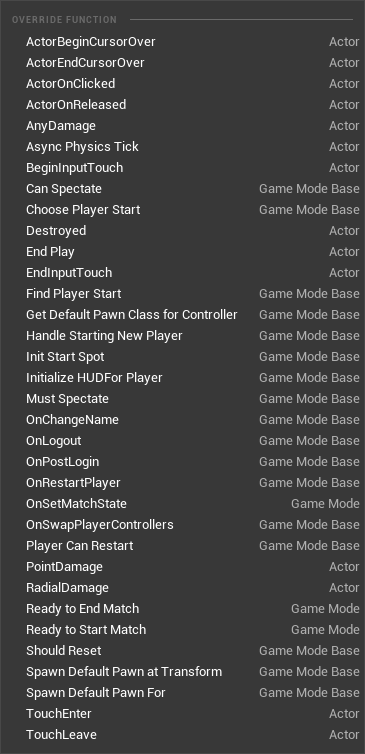 첫 번째로 살펴볼 부분은 블루프린트 버전의 Override Function 섹션입니다: