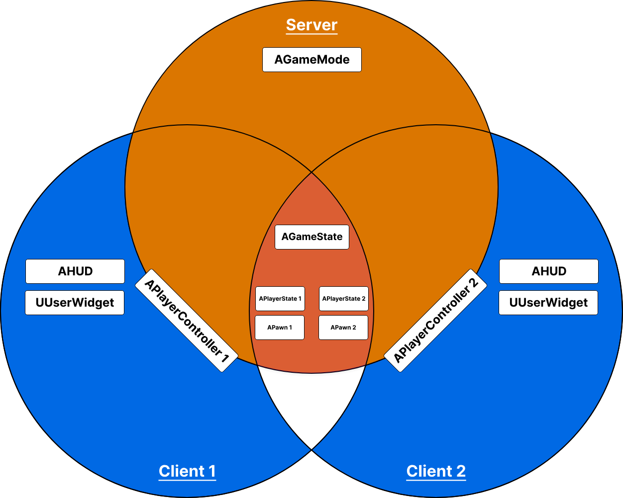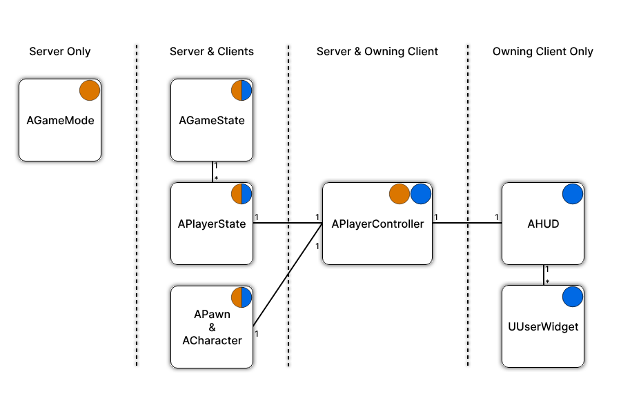 이전 섹션에서 언리얼 엔진의 서버-클라이언트 아키텍처와 주요 클래스를 살펴보았으니, 이제 이 클래스들을 네 가지 범주로 나눌 수 있습니다: