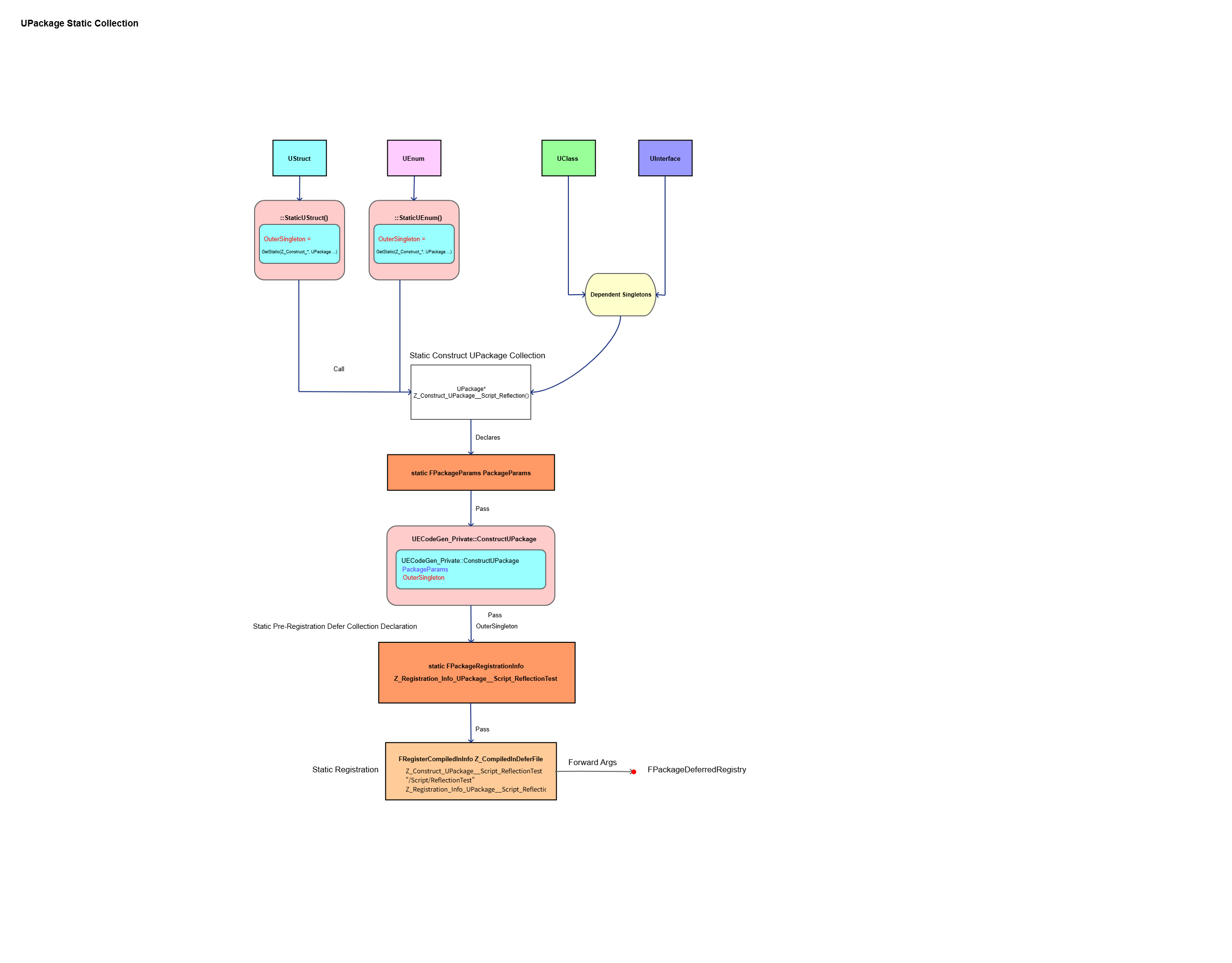 UPackage가 FPackageDeferredRegistry로 전달되면, UClass와 UInterface의 dependent singleton들은 호출할 함수 포인터를 가지게 되며, 네이티브 타입인 UEnum과 UStruct는 이를 통해 UPackage의 OuterSingleton 참조를 얻습니다.