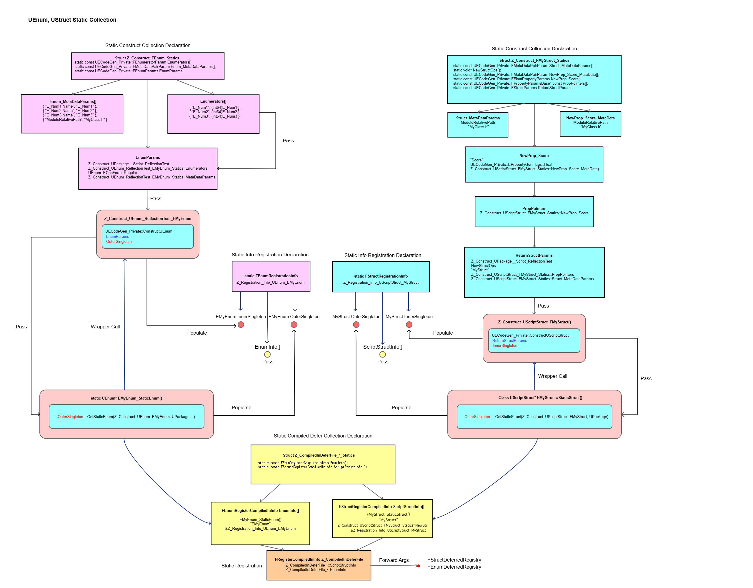 UStruct의 수집 과정은 먼저 각 원자 타입(atomic type)의 생성부터 시작합니다. 각 멤버 속성에 대한 정보가 PropPointers 배열에 수집되어 구조체 데이터와 병합됩니다. ConstructUScriptStruct 함수는 Inner Singleton을 생성하며, 구조체 파라미터는 FPropertyParamsBase 메모리 레이아웃을 기반으로 하여 구조체 간 캐스팅 다형성을 지원합니다. 초기화 리스트(={})를 사용해 파라미터를 간단하게 설정할 수 있습니다. FPropertyParams가 POD(Plain Old Data)이기 때문에, 메모리 레이아웃이 일관되고 보장된다면 타입 포인터를 통해 다른 구조체로 안전하게 변환할 수 있습니다. 또한, TCppStructOps를 활용해 네이티브 구조체의 기능을 컴파일 타임에 설정합니다. 필요한 데이터가 모두 수집된 후에는 Deferred Registration 단계로 전달됩니다.