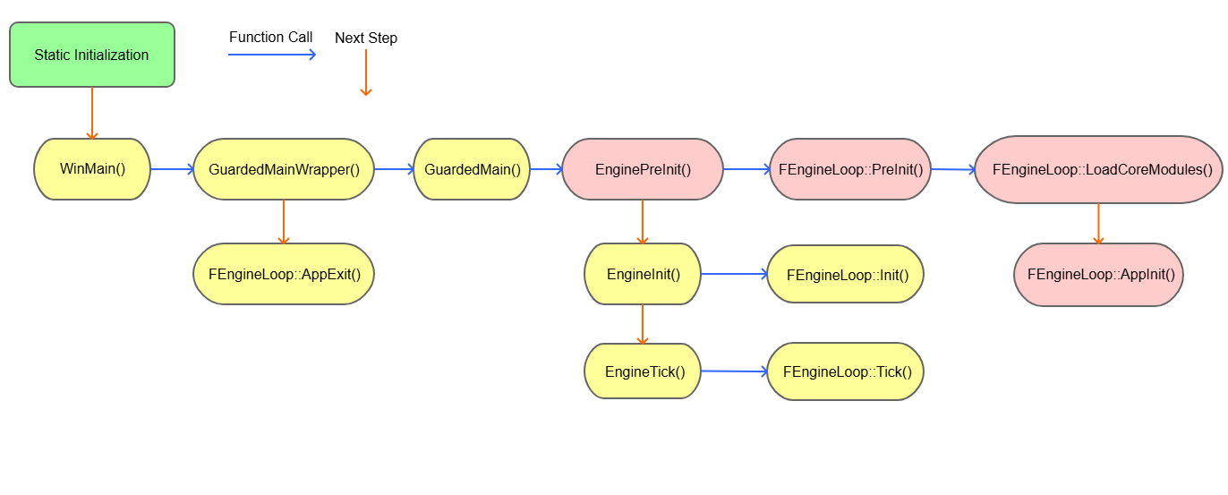 GuardedMain의 역할은 엔진 루프를 설정하고 제어를 GEngineLoop로 넘기는 것입니다. 이 과정에서 엔진의 틱 함수가 호출되는 것을 확인할 수 있으며, 그 다음 단계가 EnginePreInit입니다.