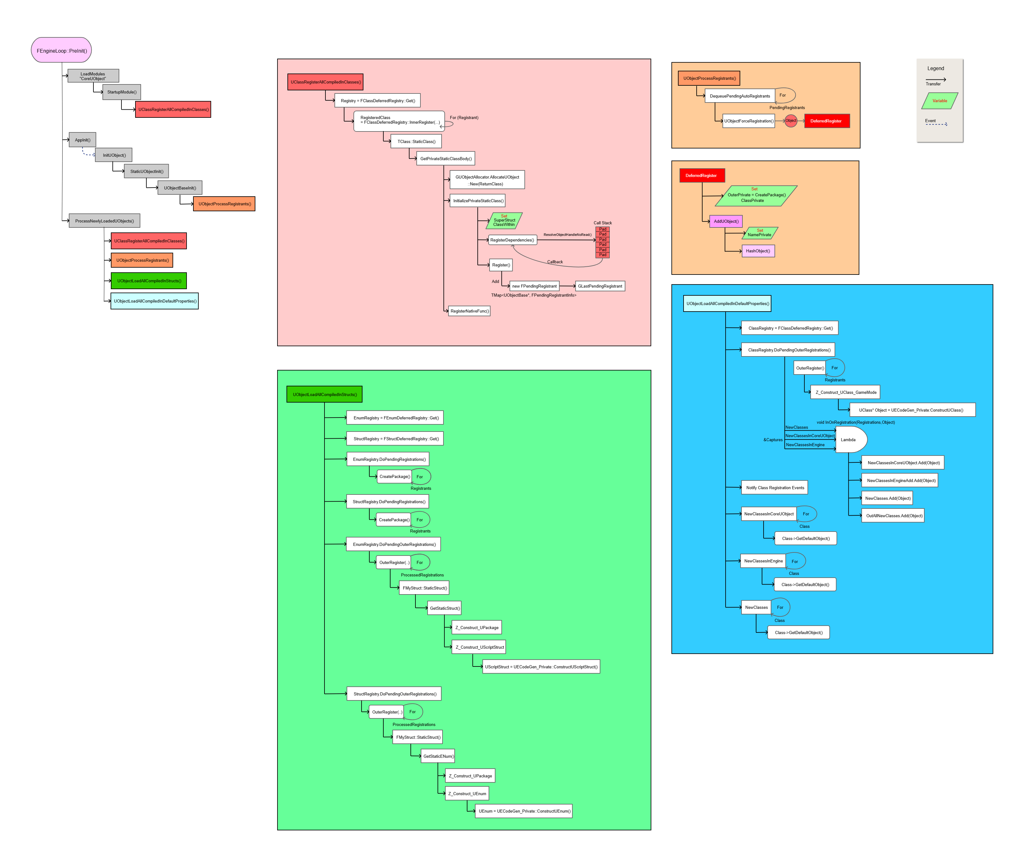 Collection 섹션에서, 사전 등록(Pre-Registration) 단계는 ClassInfo, ScriptStructInfo, EnumInfo를 수집하는 것부터 시작합니다. 이렇게 수집된 정보들은 정적 자동 초기화(static automatic initialization) 과정에서 TDeferredRegistry에 전달됩니다. 엔진이 실행되기 전에, 각 생성된 번역 단위(translation unit)에서 Z_CompiledinDeferFile이 모든 리플렉션 타입 정보를 해당 타입별 TDeferredRegistry로 전달합니다. 각 타입별로 별도의 레지스트리가 존재한다는 점에 유의해야 합니다.