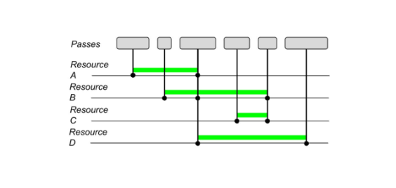 예를 들어 위 이미지에서 리소스 A는 세 번째 패스까지만 사용됩니다. 반면에 리소스 C는 네 번째 패스부터 사용되기 시작하므로 리소스 A의 수명과 겹치지 않으므로 두 리소스에 동일한 메모리를 사용할 수 있습니다.