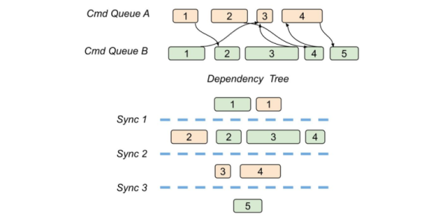 마지막으로 그래프를 통해 병렬로 실행되는 여러 명령어 대기열을 사용할 수 있으며, Dependency tree를 사용하여 이러한 메커니즘을 동기화하여 공유 리소스에 대한 Race Condition을 방지할 수 있습니다.