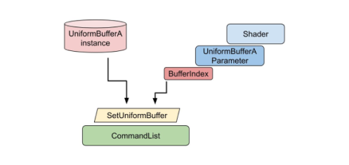 앞서 RDG(렌더링 의존성 그래프) 챕터에서 언급한 것처럼, Uniform Buffer는 셰이더 클래스 선언 내에 혹은 전역 범위에서 Shader Parameter Struct 매크로를 사용하여 정의할 수 있습니다.