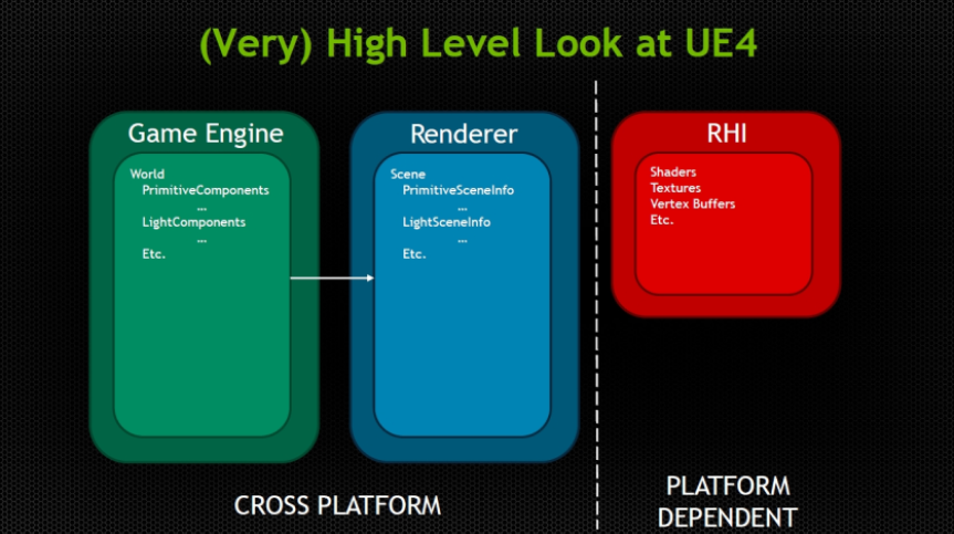 언리얼 엔진은 모바일, 콘솔, PC 등 다양한 플랫폼을 지원하는 유비쿼터스 툴이기 때문에 플랫폼에 따라 다양한 API(DirectX, Vulkan, OpenGL, Metal)를 사용할 수 있습니다. 이를 해결하기 위해 언리얼은 게임 엔진 렌더링 코드를 최대한 포괄적으로 유지할 수 있도록 이러한 모든 API에 대한 인터페이스를 추상화했습니다.