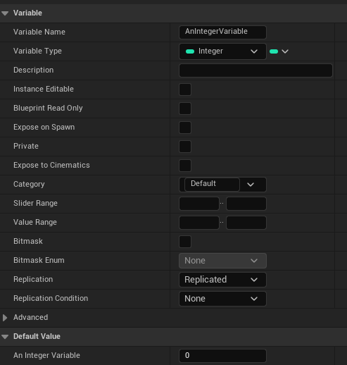 “Replication” 드롭다운 메뉴를 “Replicated”로 설정하면 이 변수는 이 액터의 모든 복제된 인스턴스에 복제됩니다.