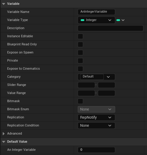 변수를 복제하는 또 다른 방법은 "ReplicatedUsing"으로 표시하는 것입니다. 블루프린트에서는 이를 "RepNotify"라고 하며, 변수의 새로운 값이 클라이언트에 복제될 때 호출되는 함수를 지정할 수 있습니다.