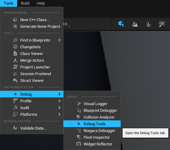 Window > Developer Tools > Debug ToolsTools/Debug/Debug Tools