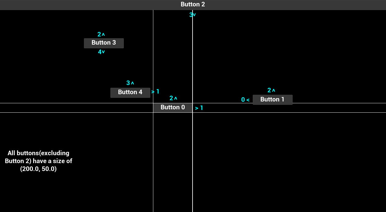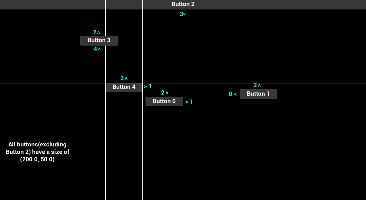 이 예시에서는 내비게이션 방향 입력 시 어떤 버튼으로 이동할 수 있는지 보여줍니다. Button 2는 아래쪽에 있는 가장 가까운 위젯으로 항상 내비게이션됩니다.