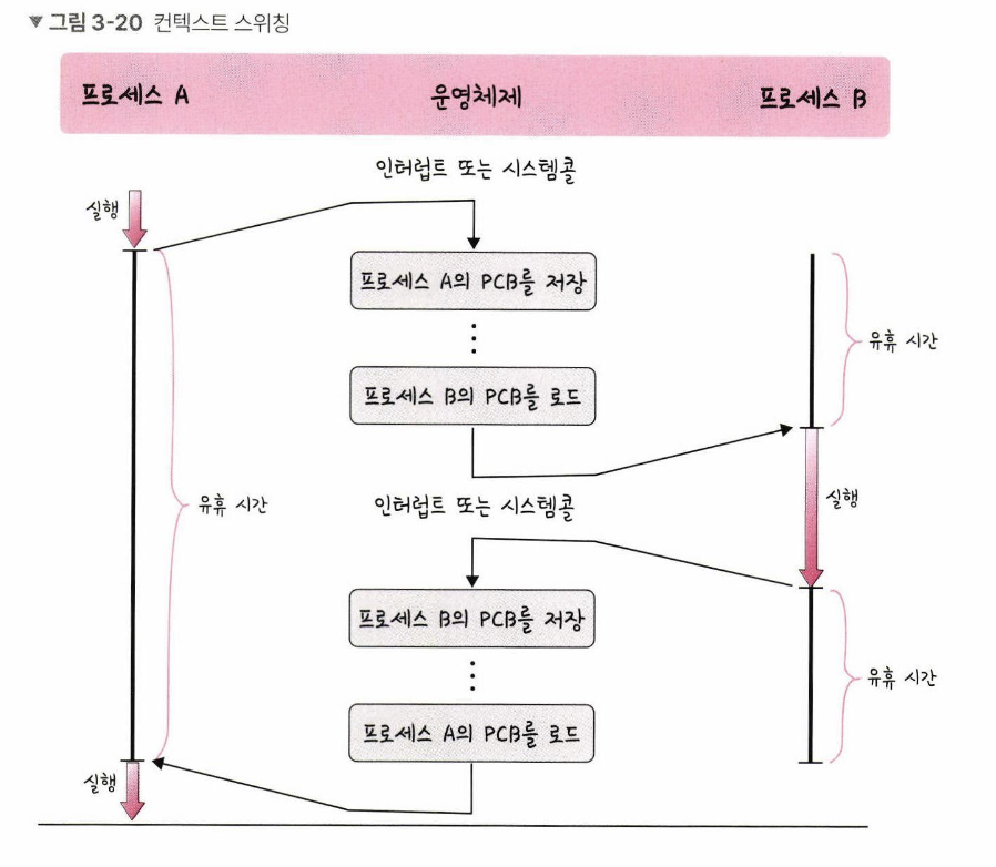 - 컨텍스트 스위칭이 일어날 때 앞의 그림처럼 유휴 시간 idle time)이 발생 -> 이뿐만 아니라 이 컨텍스트 스위칭에 드는 비용이 더 있음