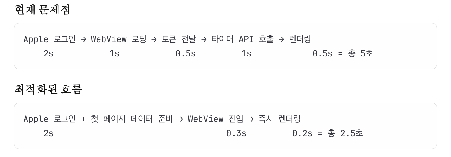 Apple 로그인 → WebView 토큰 전달 → 서버 통신 → 타이머 로딩까지의 과정에서 지연이 발생함. 사용자 입장에서 웹뷰가 로드되는 동안 빈 화면을 마주함