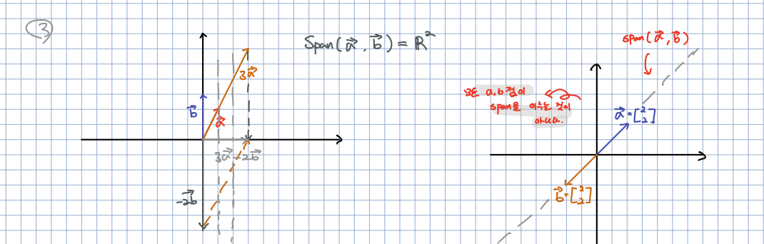 🎈 반대로 , 를 보여주는 두번째 그래프의 span은 무었일까요? 이 두선으로 표현할 수 있는 부분은 직선뿐이 보이지 않습니다. 결국 span은 하나의 직선이라고만 말할 수 있습니다.