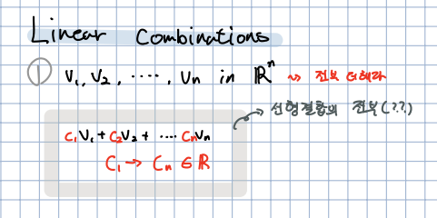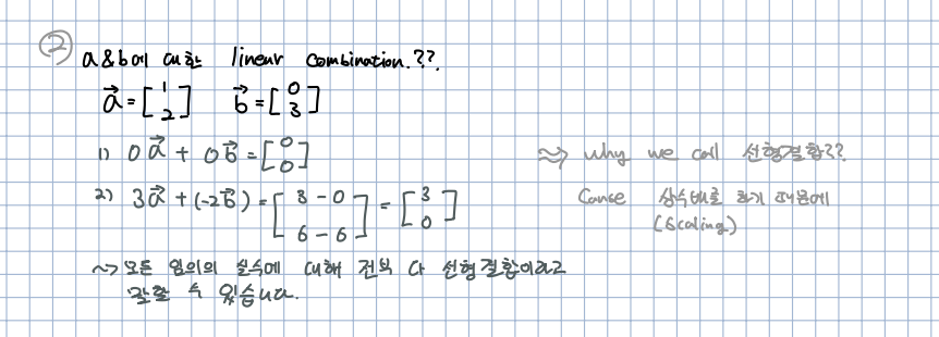 🎈 선형 결합이란 위에서 볼 수 있듯이, 상수배를 한 벡터들의 합으로 나타낼 수 있습니다. 수업에서 위의 회색 박스가 전부라고 이야기 합니다. (실제로 그런거 같습니다..ㅎ)