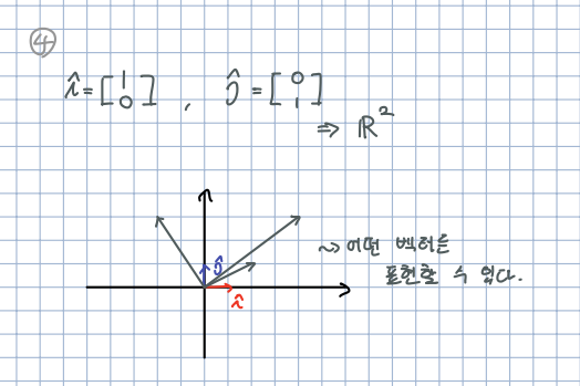 🎈 조금 더 시각적으로 확인해보겠습니다. 첫번째 그래프에서 즉, 위에서 언급한 , 의 벡터들로는 의 모든 값들을 표현할 수 있습니다. 이를 라고 표현하며, 라고 표현할 수 있습니다.