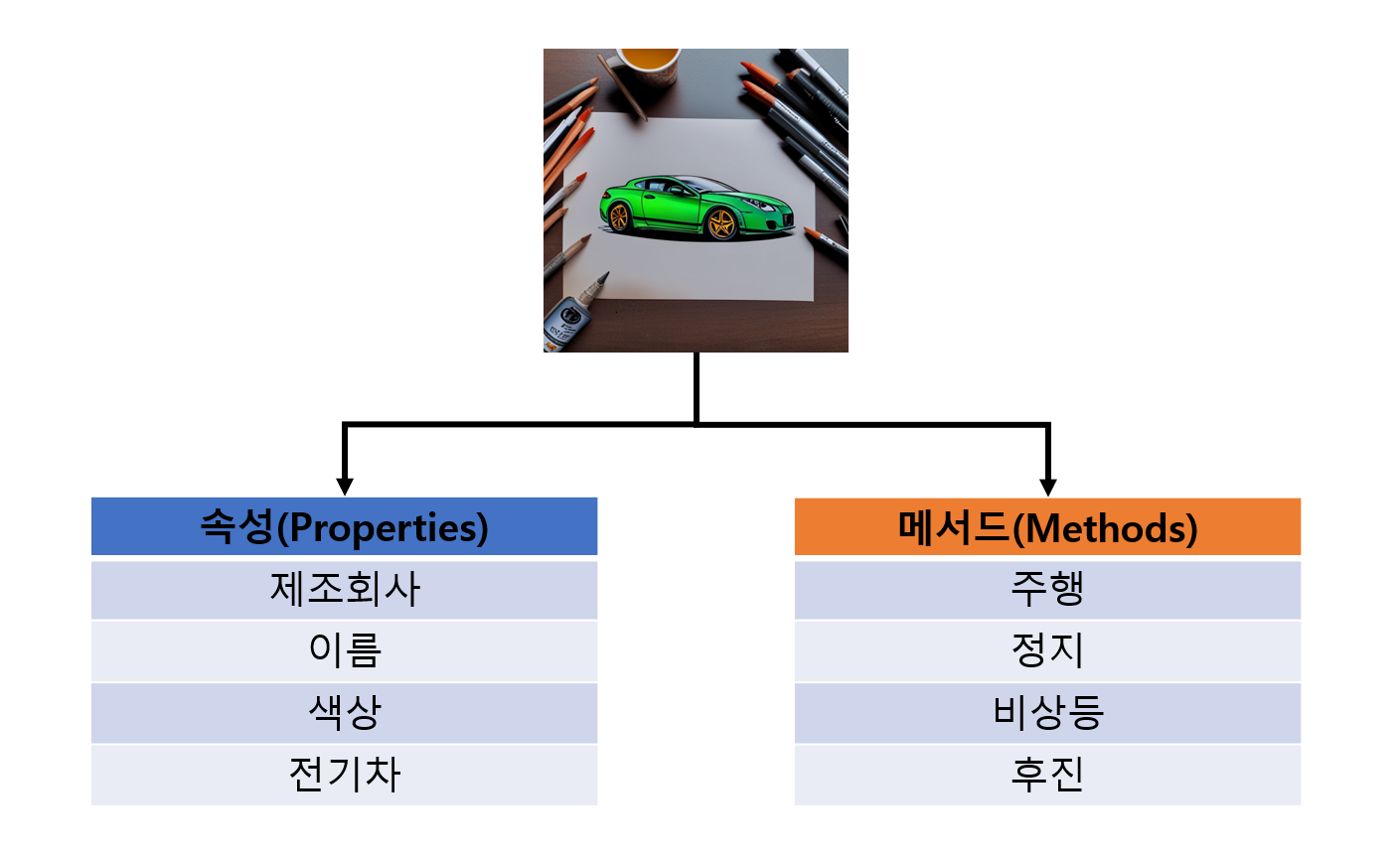 속성은 객체의 상태나 특성 혹은 특징, 즉 자기 자신을 나타내기 위한 정보라고 생각하면 이해하기 쉽습니다. 주로 자동차를 예시로 설명합니다. 자동차의 제조회사, 이름, 색상 등을 속성이라 할 수 있습니다.