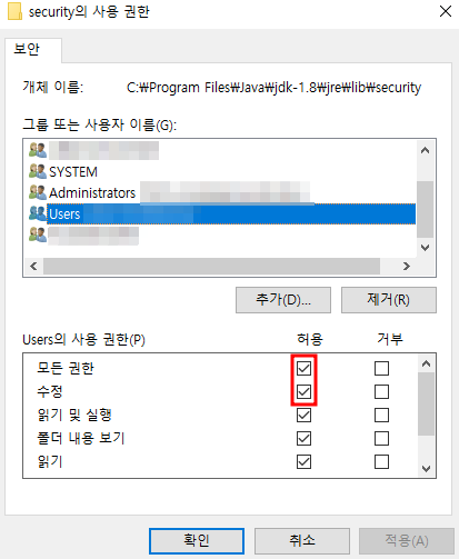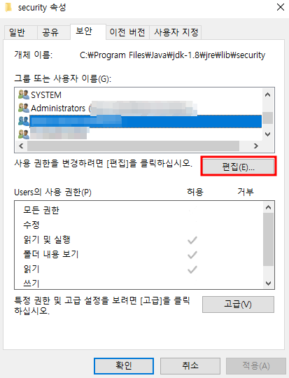 본인이 사용하는 계정을 선택 -> 편집 -> 수정 권한(혹은 모든 권한) 체크
