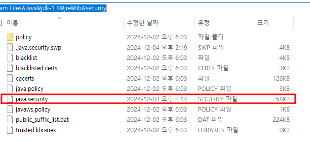 (+ JAVA 17 에서는 ~~~ Program Files\Java\jdk-17\conf\security 경로에 java.security 파일이 있다. )
