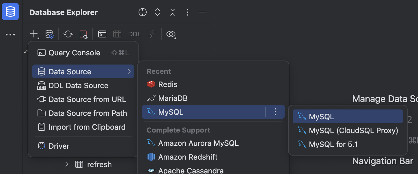 1. + 선택 후 Data Source, MySQL 선택하기