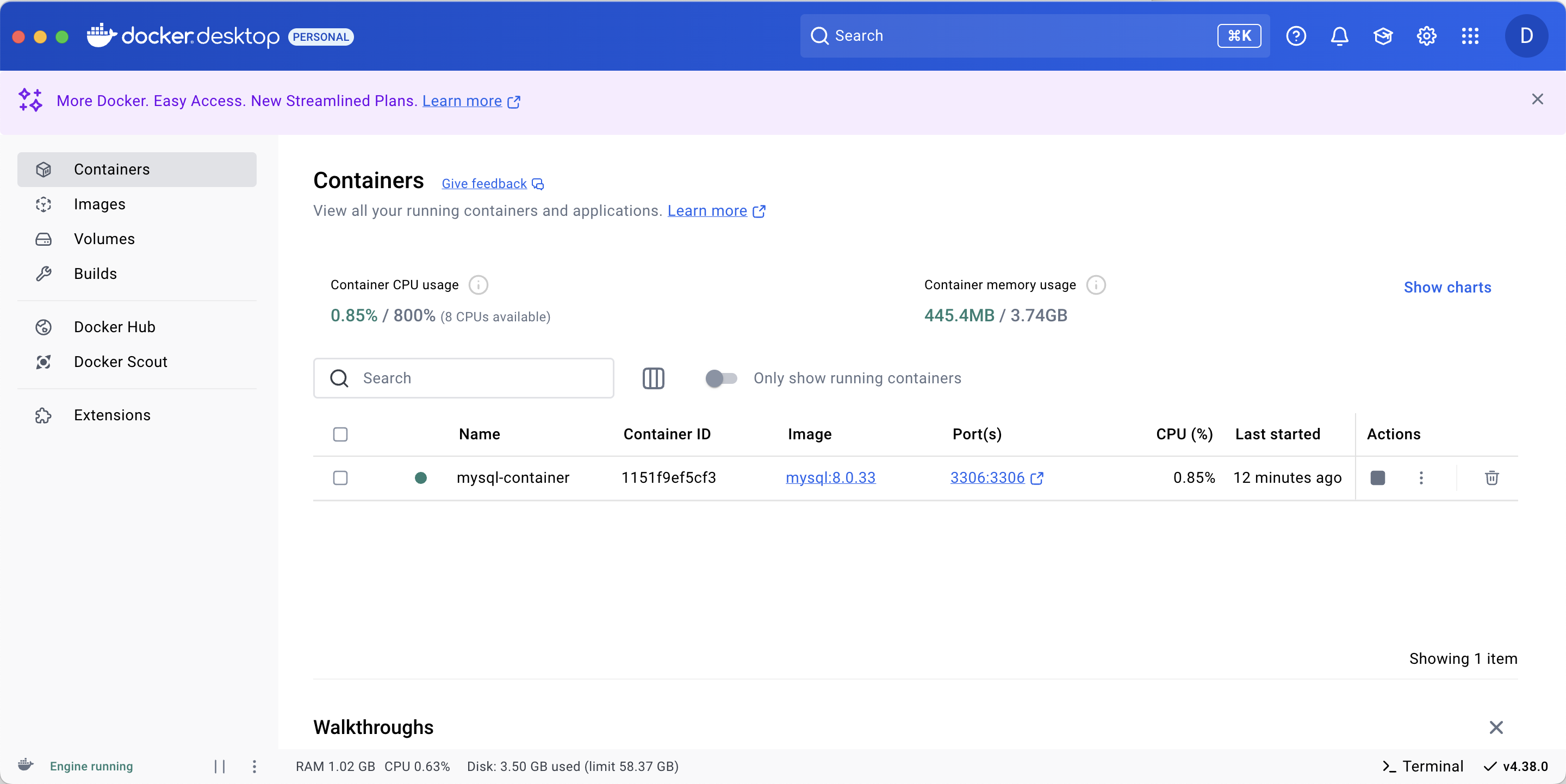어차피 teminal로 확인했기 때문에 굳이 ui로 확인하지 않아도 되는 부분이지만, docker app에서도 올려준 이미지와 컨테이너를 확인할 수 있다.