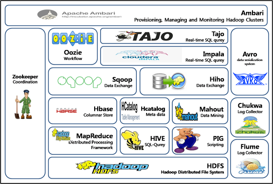 하둡의 코어 프로젝트는 HDFS와 MapReduce지만 그 외에도 다양한 서브 프로젝트들이 많이 있다. 하둡 에코시스템은 바로 그 프레임워크를 이루고 있는 다양한 서브 프로젝트들의 모임이라고 볼 수 있다. 아래 크림들은 하둡 에코시스템을 나타낸 것이다.