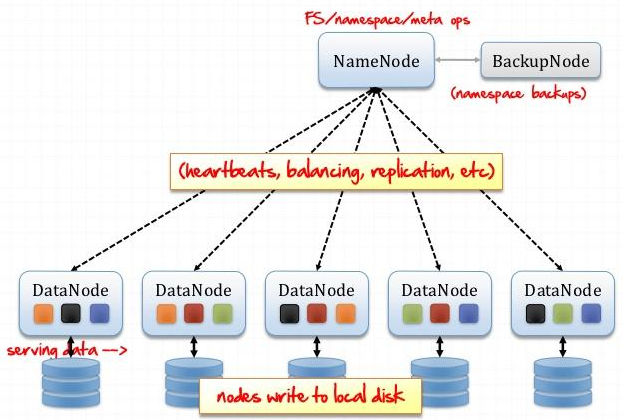 네임 노드와 데이터 노드로 이루어져 있다. 네임 노드는 HDFS에서 마스터 역할을 하며 서버 한 대로 구성된다. 네임 노드는 파일 시스템 트리와 모든 파일과 디렉터리에 대한 메타데이터를 유지한다.