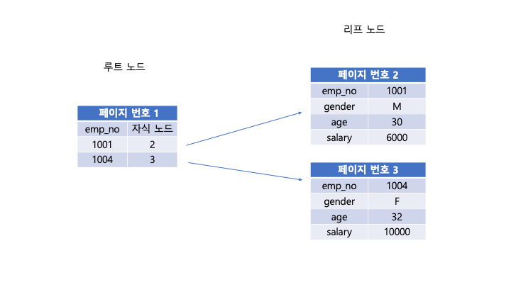 emp_no를 Primary key로 지정한 클러스터링 인덱스의 예이다.