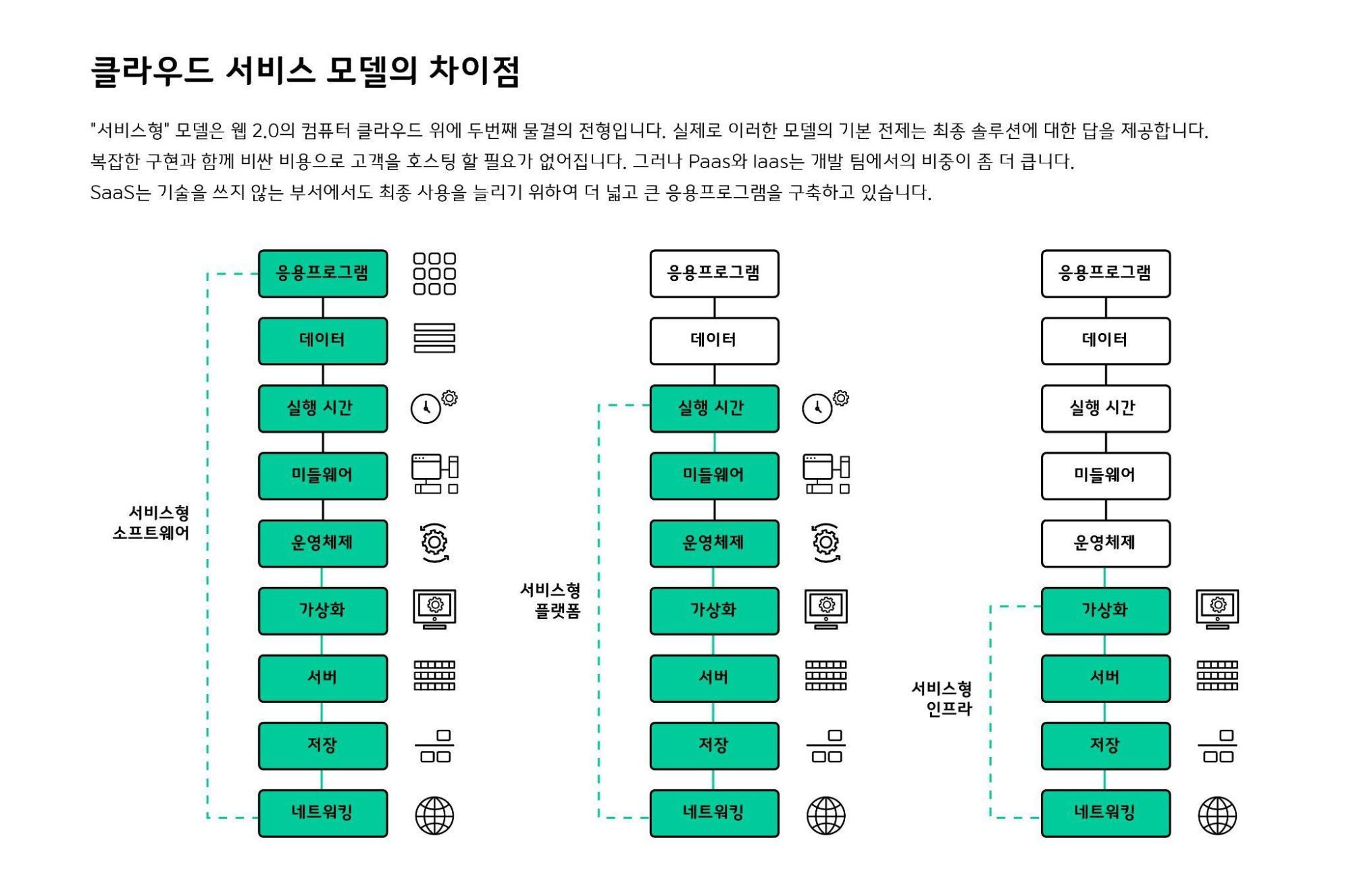 - PaaS - 서비스형 플랫폼 PaaS는 ‘서비스로서의 플랫폼’이라는 의미를 담고 있습니다. PaaS는 IaaS 형태의 가상화된 클라우드 위에 사용자가 원하는 서비스를 개발할 수 있도록 개발 환경(Platform)을 미리 구축해, 이를 서비스 형태로 제공하는 것을 의미한다 PaaS는 운영체제, 미들웨어, 런타임 등을 미리 구축한 상태로 제공하기 때문에 IaaS보다 관리상의 자유도가 낮습니다. 하지만 PaaS 사용자는 서비스 외적인 부분에 신경 쓸 필요가 없고, 오로지 애플리케이션 개발과 비즈니스에만 집중할 수 있으며, IaaS와 마찬가지로 별도의 인프라를 유지하고 운영하는 데 별도의 인력이 소요되지 않기에 하드웨어 및 소프트웨어 인프라 관리에 드는 비용을 절약할 수 있습니다. 대표적인 PaaS: 세일즈포스닷컴의 Heroku나 Redhat(레드햇)의 OpenShift 등